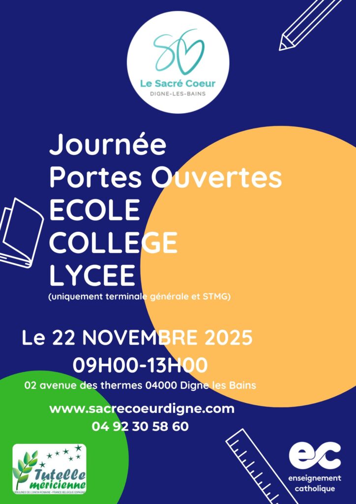 Le groupe scolaire du Sacré-Cœur de Digne-les-Bains vous ouvre ses portes le samedi 22 novembre 2025, de 9h à 13h, pour une matinée de découverte, de rencontres et d’échanges.
